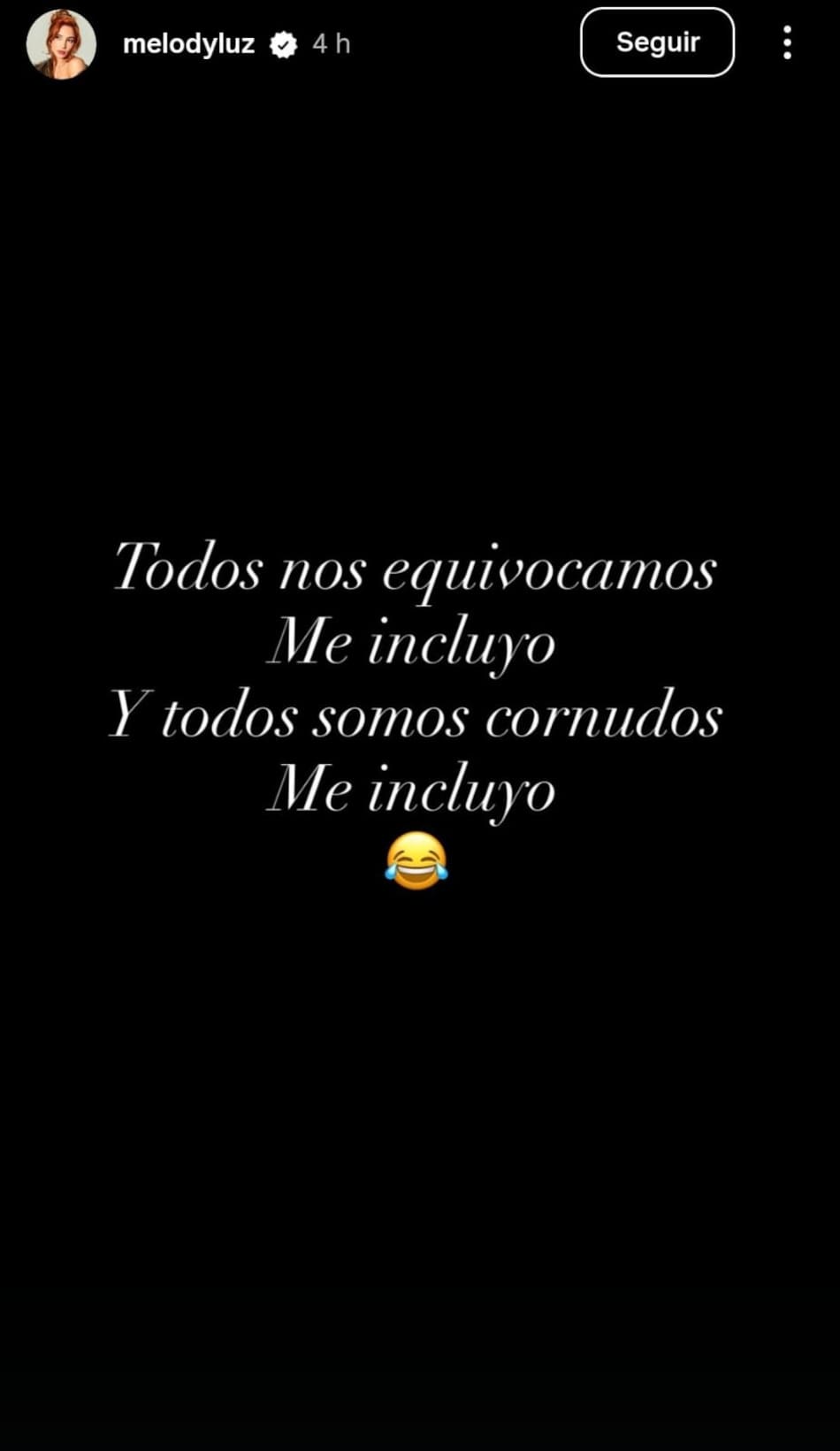 En otra historia, la bailarina hizo una autocrítica pública sobre lo vivido: “Todos nos equivocamos. Me incluyo. Todos somos cornudos. Me incluyo”, mostrando un intento por procesar lo ocurrido con humor.