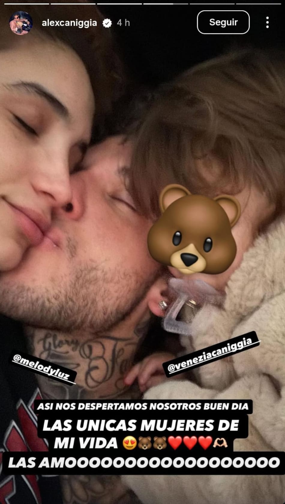 En la fotografía se los ve acostados en la cama, mientras Alex besa a Melody y a su hija Venezia. La publicación fue acompañada por un mensaje que generó repercusión: “Así nos despertamos nosotros. Buen día. Las únicas mujeres de mi vida. Las amo”.