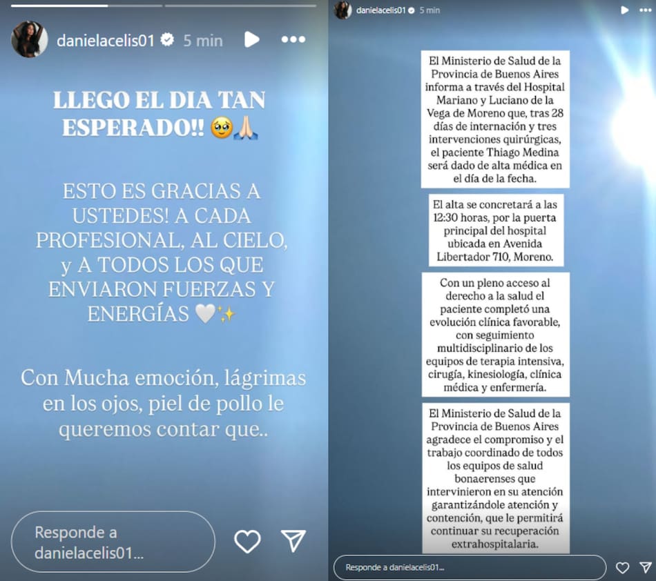 Horas antes, Daniela Celis lo había confirmado a través de sus redes sociales con un posteo. “El Ministerio de Salud de la Provincia de Buenos Aires informa a través del Hospital Mariano y Luciano de la Vega de Moreno que, tras 28 días de internación y tres intervenciones quirúrgicas, el paciente Thiago Medina será dado de alta médica en el día de la fecha”, informó la influencer.
