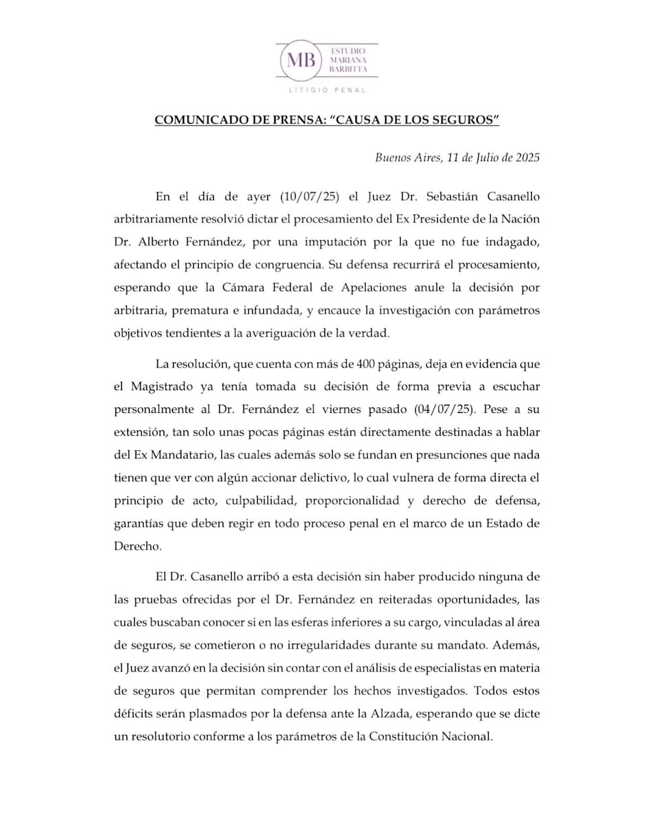 “El juez avanzó en la decisión sin contar con el análisis de especialistas en materia de seguros que permitan comprender los hechos investigados”, señala el texto y agrega: “Todos estos déficits serán plasmados por la defensa ante la Alzada, esperando que se dicte un resolutorio conforme a los parámetros de la Constitución Nacional”.