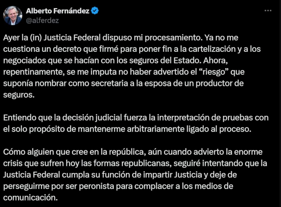 Alberto Fernández atribuyó su procesamiento en la causa Seguros a una “decisión judicial que fuerza la interpretación de pruebas con el solo propósito de mantenerme arbitrariamente ligado al proceso”.