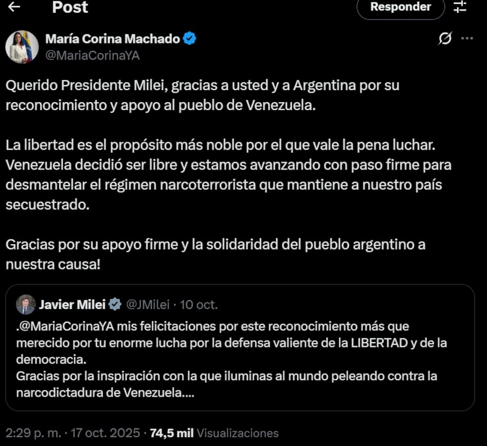 La líder opositora venezolana, María Corina Machado, le agradeció este viernes a Javier Milei por su “reconocimiento al pueblo de Venezuela” en su mensaje de felicitación por la obtención al Premio Nobel de la Paz 2025 que se le otorgó hace una semana.